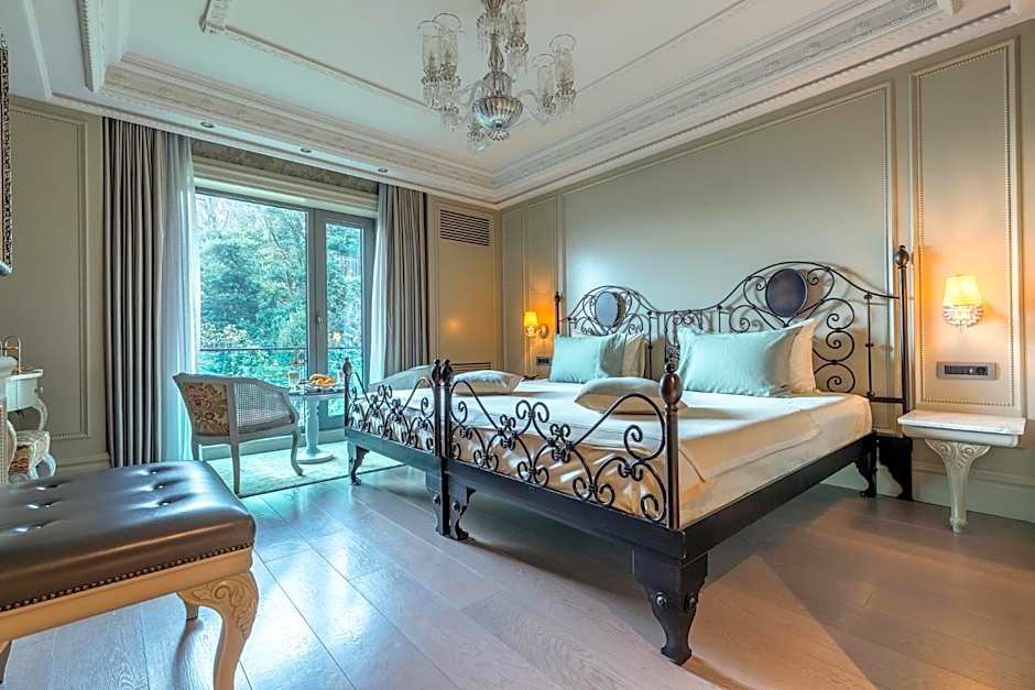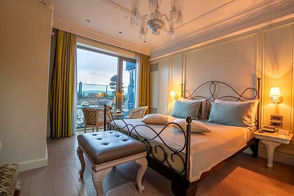 This luxurious suite features a ceiling graced with Seljuk motives, elegant wallpaper and parquet floors. It is furnished with a nostalgic wrought iron bed with a comfortable mattress, and a chic working desk. It offers extensive views of the Bosphorus. It also includes a LED, which has a special frame which can also be used as a mirror. The spacious bathroom is covered with beautiful marble and granite natural stones.